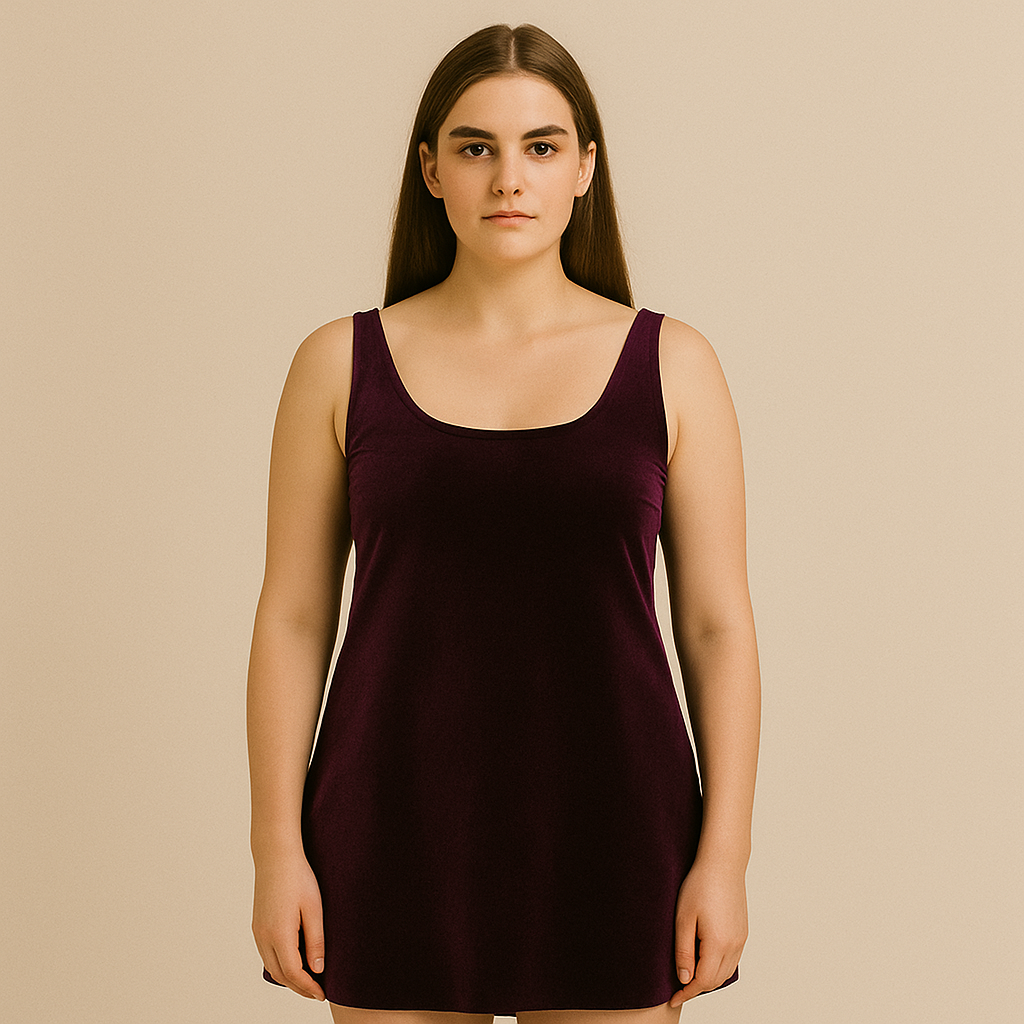 Krótka sukienka o linii A, wykonana z miękkiego aksamitu w głębokim, śliwkowym odcieniu. Model posiada grube ramiączka i elegancko wycięte plecy, co dodaje mu lekkości i kobiecego uroku. Idealna na wieczorne wyjścia, randki i specjalne okazje.