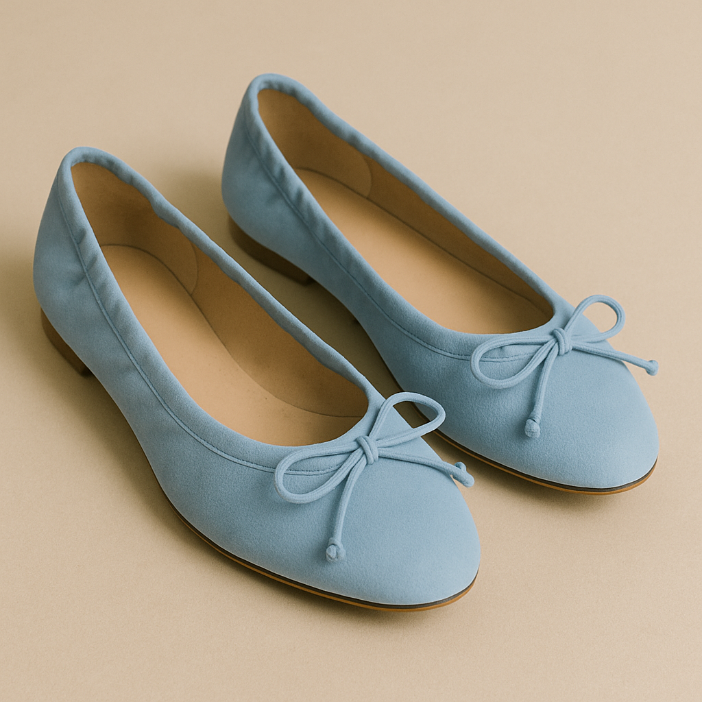 Baleriny z miękkiego zamszu w odcieniu jasnego nieba, wykończone elastyczną linią cholewki, która dopasowuje się do stopy. Przód zdobi subtelna kokardka, dodająca romantycznego uroku. Idealne na co dzień, do sukienek, spodni i lekkich stylizacji w stylu casual chic.