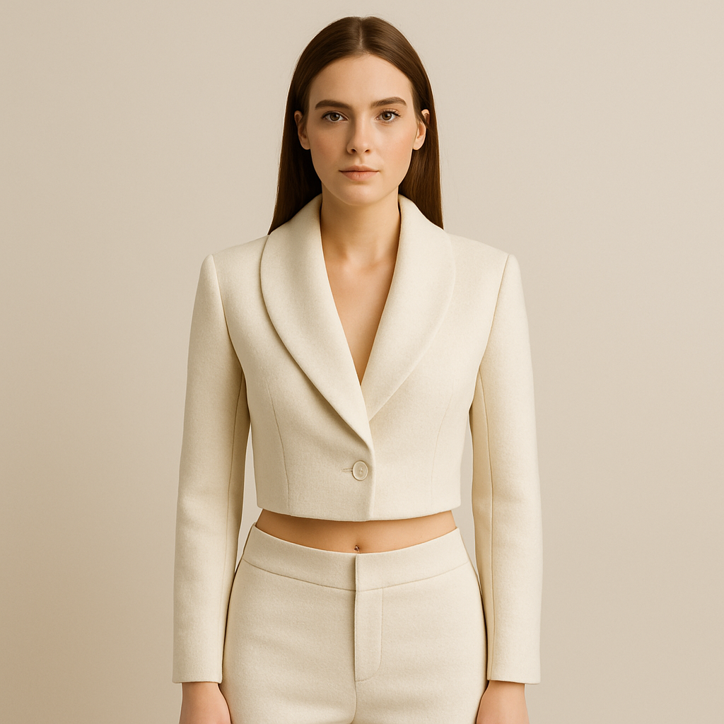 Stylowy, krótki żakiet wykonany z miękkiej, szczotkowanej wełny. Model wyróżnia się dopasowanym krojem i efektownym szalowym kołnierzem, który dodaje elegancji każdej stylizacji. Idealny do pracy, spotkań lub wieczornych wyjść — świetnie łączy się z klasycznymi spodniami lub spódnicą.