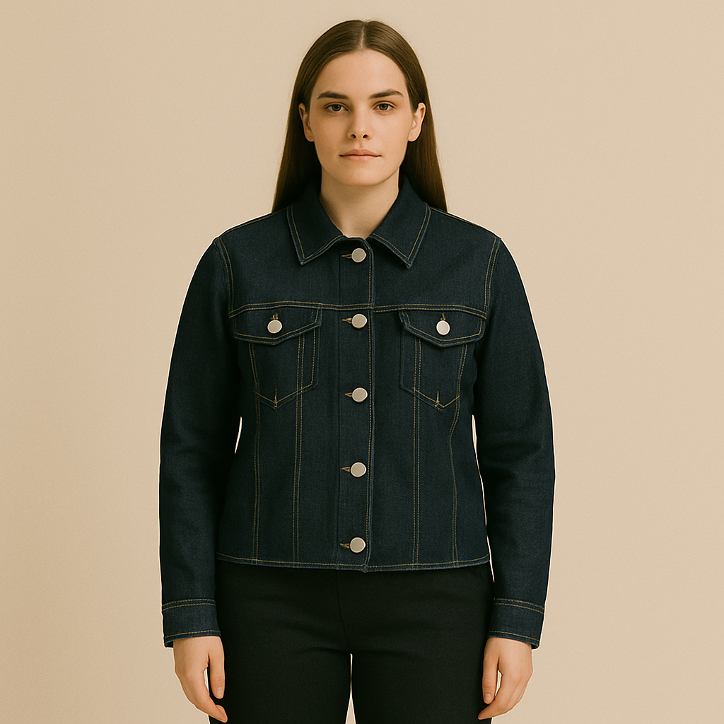 Dopasowana kurtka jeansowa w ciemnym odcieniu indygo z wyrazistymi przeszyciami i dużymi srebrnymi guzikami. Surowe wykończenie dolnej krawędzi dodaje jej nowoczesnego charakteru. Idealna do miejskich stylizacji – pasuje do sukienek, spodni i casualowych zestawów.