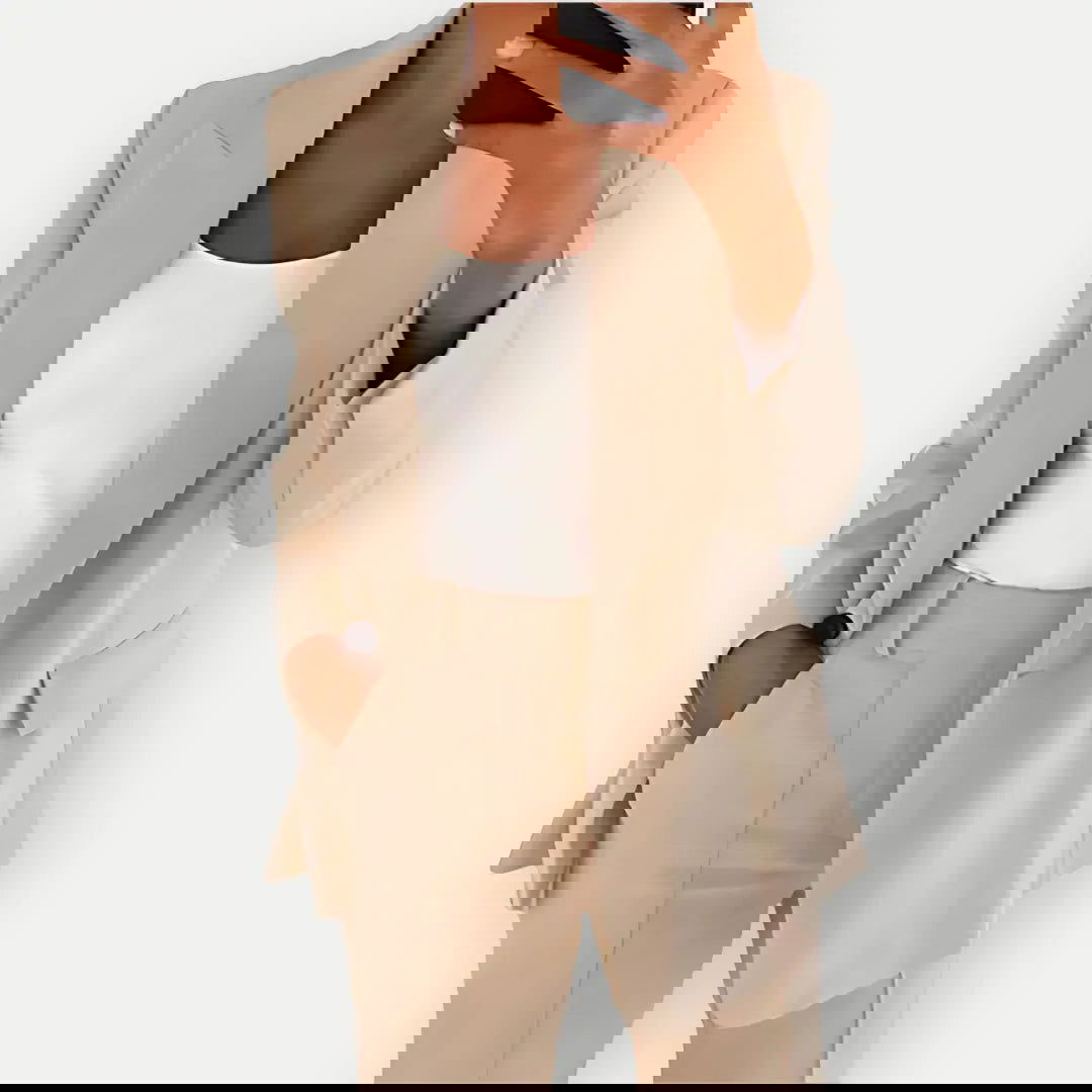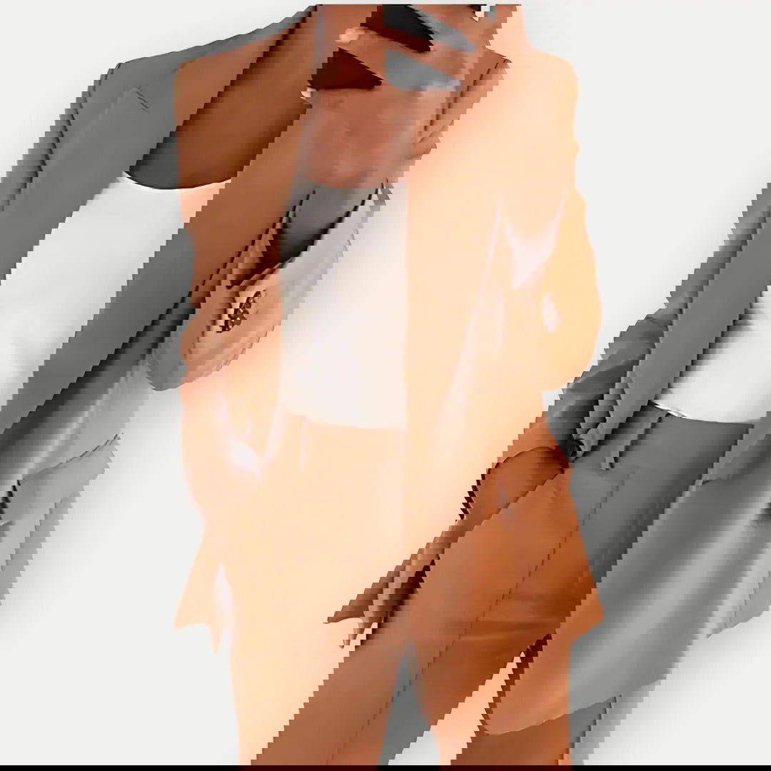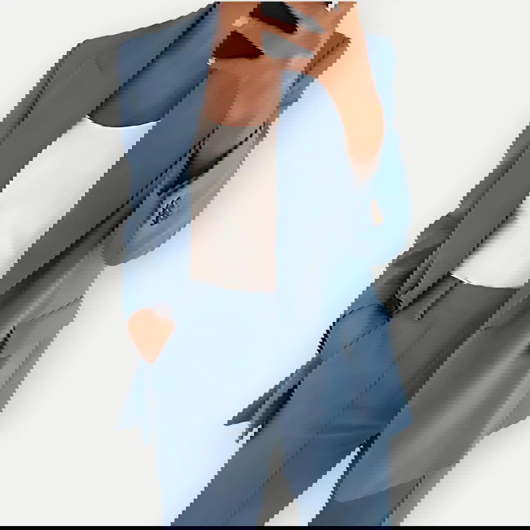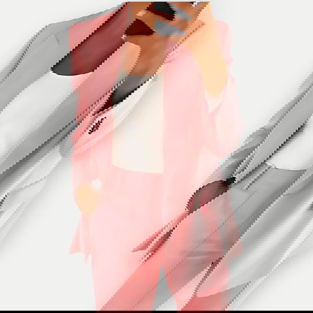 Ten garnitur o dopasowanym, kobiecym kroju to połączenie profesjonalnego wyglądu i pełnego komfortu noszenia. Wykonany z gładkiej, lekkiej tkaniny, doskonale układa się na sylwetce, zapewniając swobodę ruchów i elegancki wygląd przez cały dzień. Minimalistyczna marynarka z klapami i proste spodnie z kieszeniami tworzą zestaw idealny zarówno do pracy, jak i na wyjątkowe okazje.