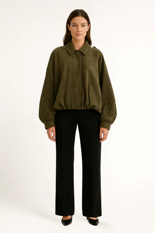 Ta damska kurtka o oversize’owym kroju łączy wygodę z nowoczesnym stylem. Wykonana z miękkiego materiału przypominającego zamsz, zapewnia komfort i lekkość w noszeniu. Zapięcie z przodu, klasyczny kołnierz i luźne rękawy zakończone mankietami sprawiają, że to model praktyczny i pasujący do wielu stylizacji – od biurowych po casualowe. Elastyczny dół dodatkowo podkreśla kształt i zapewnia lepsze dopasowanie.